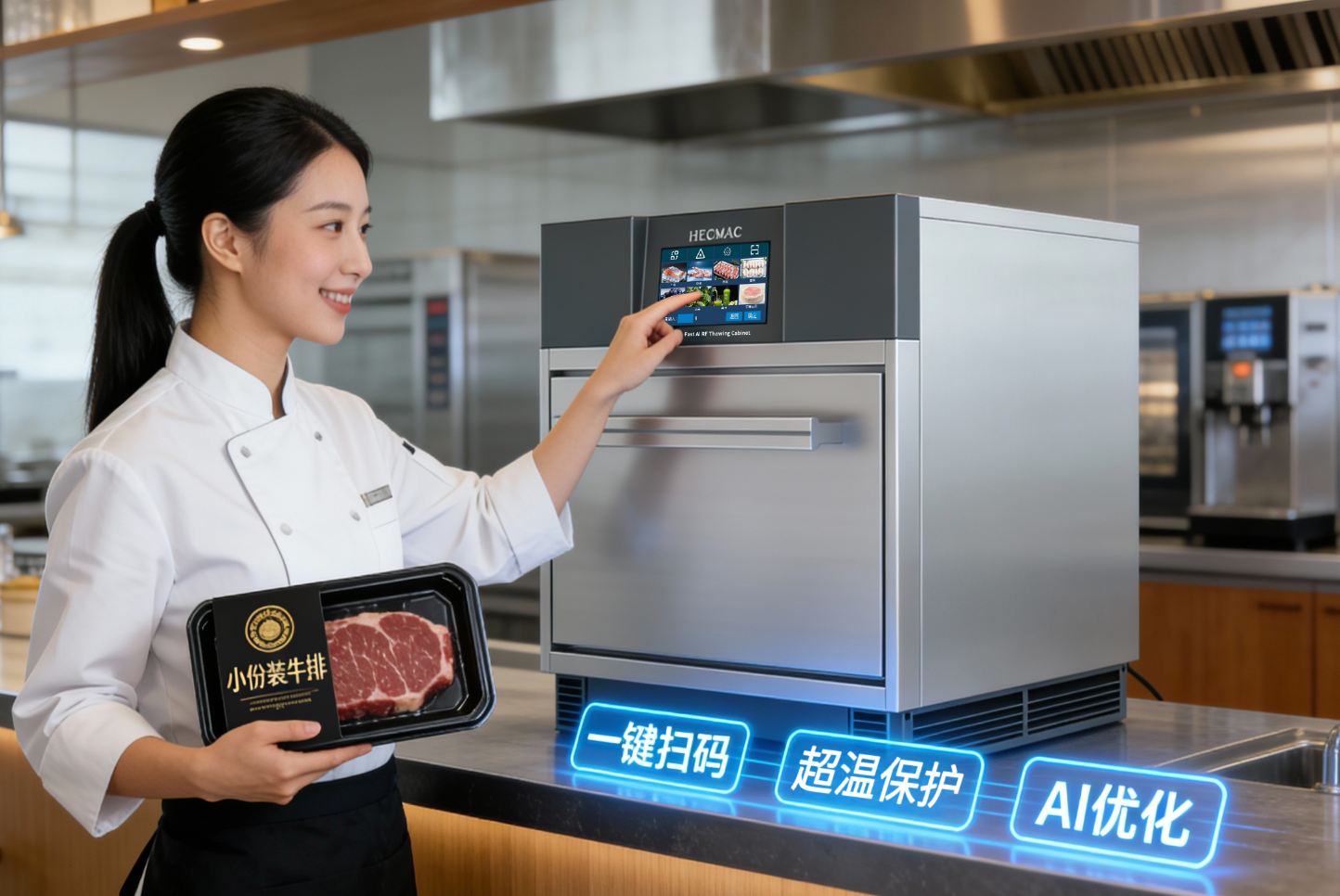 有效防范食材局部熟化或变质,保障食材营养成分不流失,同时避免口感受损 支持一键扫码,搭载智能菜单系统,融合A优化技术;操作简洁,内置预设菜单模板,可实现一键解冻功能,有效提升运营效率,优化解冻全流程